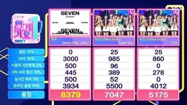 인기가요 정국 1위, 8월 첫째주 뉴진스와의 1위 후보 맞대결에서 출연없이 정국 ‘세븐 1위 차지